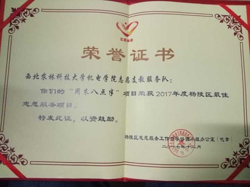 2017年12月5日,杨陵区志愿服务工作领导协调小组办公室在北绣山活动中心召开杨凌区2017年度特色志愿服务项目工作总结暨表彰大会。西北农林科技大学机电学院志愿支教服务队的“周末八点半”项目荣获2017年度杨陵区最佳志愿服务项目。