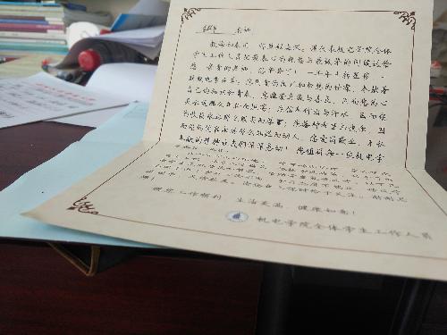 “李群卓老师,您好。我是机电学院辅导员,我院机械类专业共有174人在您班上课,其中跟班上课的重修的有2人,这是学工办制作的助学贺卡,咱们一同共同关爱学生,谢谢您…”给2017级机械类专业上《工程制图(甲)》的李老师在学期开始就收到了来自学工办辅导员的一封信。 与李老师一样,其他给机电学院上课的老师也都收到了学工办辅导员的一封信,“这是机电学院连续第三年制作助学贺卡——给任课教师的一封信了!”负责学业预警的辅导员马香丽说道。
